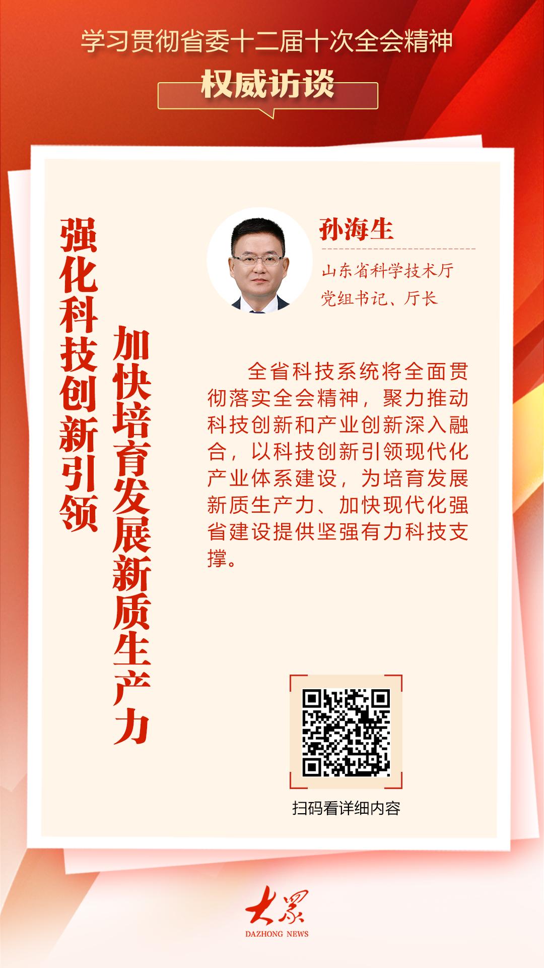 省委十二届十次全会发布《加快建设更高水平现代化省份引领新生产力发展》专章,充分体现了省委、省政府对科技创新的高度重视,凸显了科技创新引领新生产力发展的关键作用。全省科技系统将全面贯彻落实全会精神,共同推动科技创新与产业创新深度融合,以科技创新引领现代产业体系建设,为培育发展新生产力、加快建设现代化强省提供坚强科技支撑。一是努力做到构建强大的科技力量战略体系,全面提升科技创新综合实力。全力打造国家区域科技创新中心和产业科技创新高地,支持老山实验室等重点创新平台开展有组织的科学研究,全面实施基础研究十年行动,加快产出一批原创性、颠覆性科技成果。精准组织实施基础科技攻关,聚焦工业主板、高端芯片等关键领域,攻克一批关键共性技术和先进工艺装备,为我国重要产业链供应链安全可控作出山东贡献。二是推动现代与现代深度融合n 科技和产业创新支撑现代产业体系建设。加快实施重点行业科技行动计划,建立“企业求技术、成果求市场”双向公开领导机制,统筹推进重大技术突破和成果转化。通过产学研融合加强企业主导企业创新,支持企业组建创新联盟,牵头重大科技项目,建设高能创新平台。完善科技创新服务体系,增强“山东科技市场”供需对接能力,加快概念验证和试点验证平台布局建设,推动更高质量科技成果转化逻辑成就转化为现实生产力。三是深化科技体制机制改革,加快构建科技创新生态系统。全面强化科技创新对教育和人才的影响,推动教育、科技人才联动改革。深化人才评价和激励改革,建立以创新、质量、效益、贡献为核心的人才评价体系,为科研人员投身研究创造良好条件。推动学校、院校、企业之间高层次人才“互招共享”,畅通人才交流渠道,充分激发创新创造活力。 (大众新闻记者王亚男编译,张喜坤、王亚杰编辑)